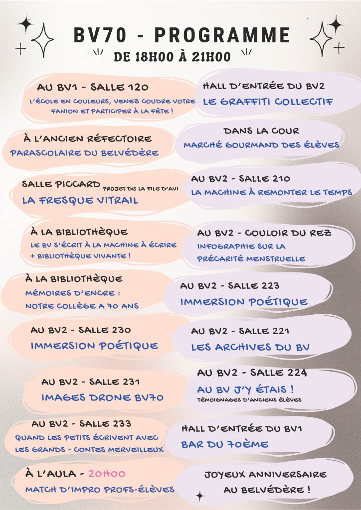 Catégorie Associations Date 03 Mar 2026 Heure 18:00 – 21:00 Portes ouvertes 70 ans collège du Belvédère Partagez cet événement + Ajouter à mon Agenda Google + Exportation iCal / Outlook 00 jours 00 heures 00 minutes 00 secondes