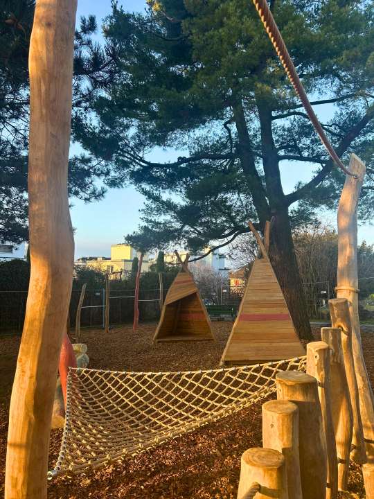 L’ensemble des jeux a été changé. La place est équipée de barres fixes et d’une structure de grimpe en bois agrémentée de cordes et de filets. Les enfants peuvent s’amuser dans deux tipis.